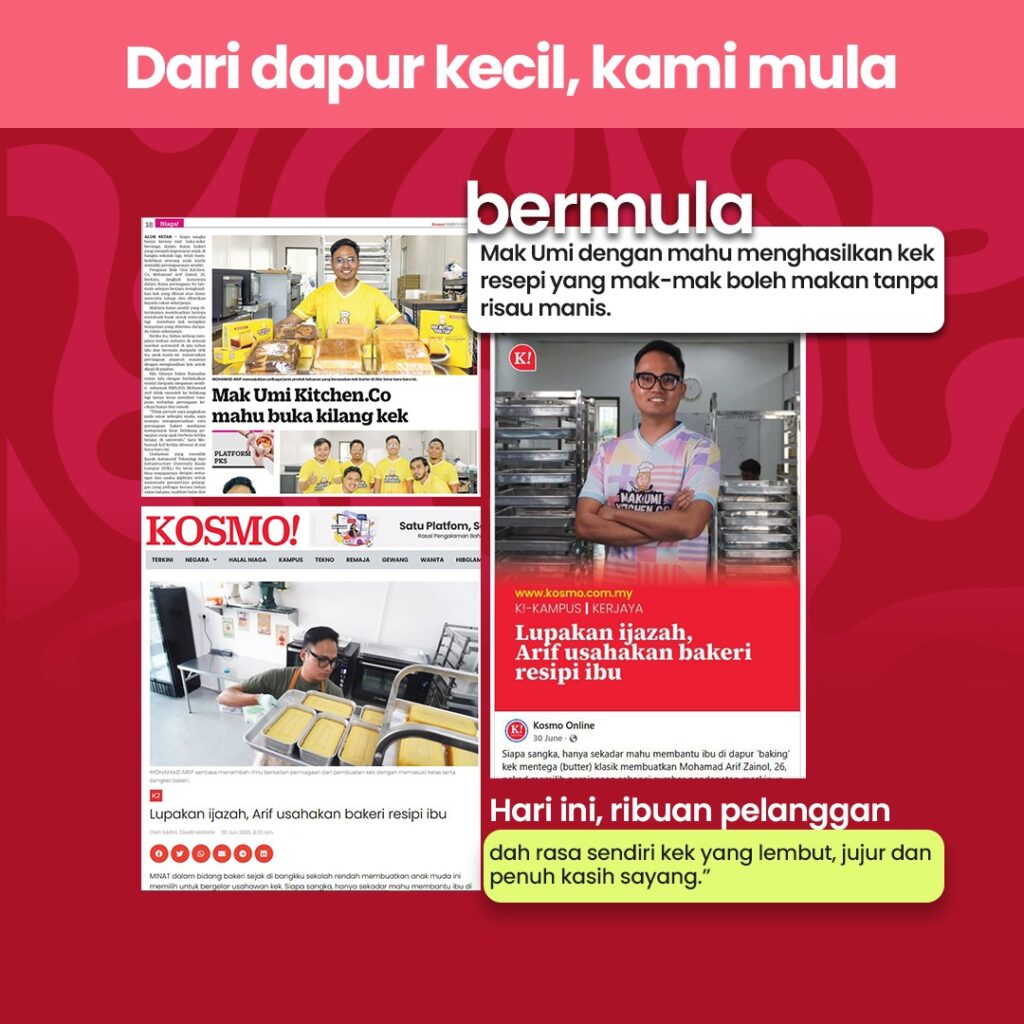 Setiap potongan dibuat dengan bahan sebenar – pure butter, telur segar, gula berkualiti dan sentuhan kasih sayang Umi sendiri.
